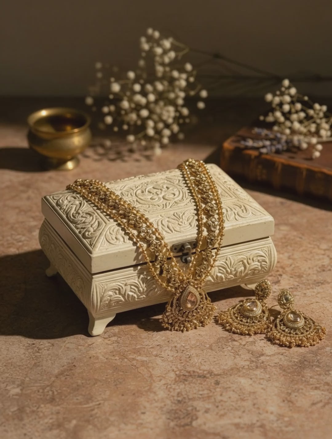 Artistry: Traditional Kundan settings with an "Antique Gold" finish for a vintage, royal look.