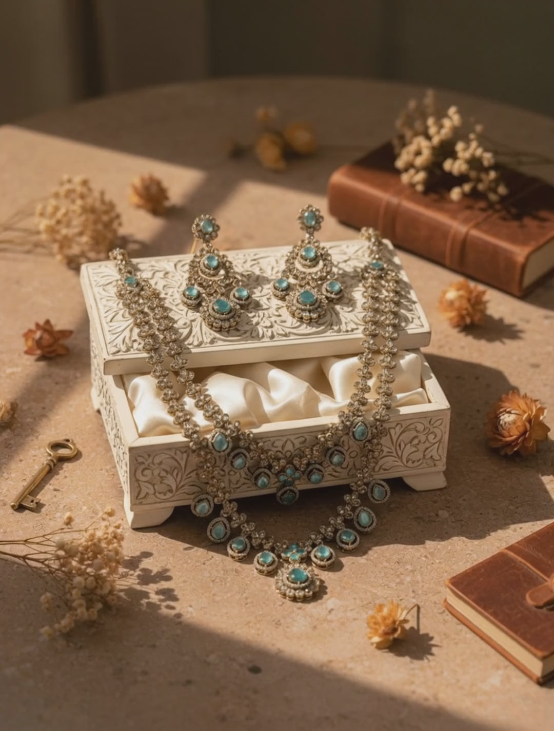 Indulge in the ethereal beauty of our Empress of the Sea jewelry set—a masterpiece of traditional artistry reimagined for the modern connoisseur. This breathtaking ensemble features a double-layered Nizami-style Haar, meticulously handcrafted by master artisans who have preserved the ancient secrets of Indian jewelry making.