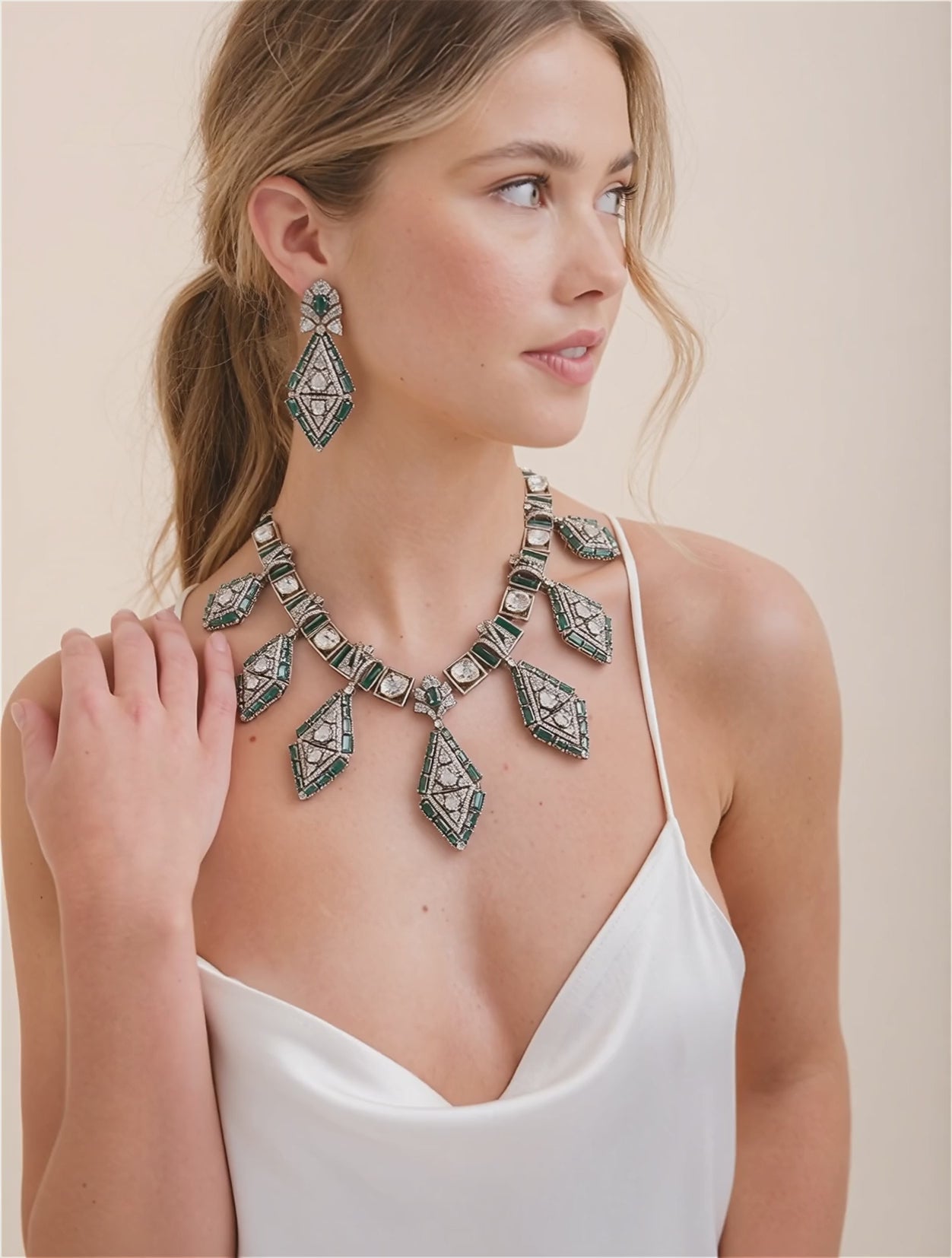 Exude a sense of royal sophistication with this breathtaking jewelry set. Each piece is masterfully designed with pure, real Emerald healing stones, showcased in dramatic teardrop and hexagonal cuts. Encircled by a shimmering halo of brilliant accents and suspended from a refined gold-toned chain, this collection captures the deep, lush essence of the forest, making it a powerful statement of elegance and vitality.