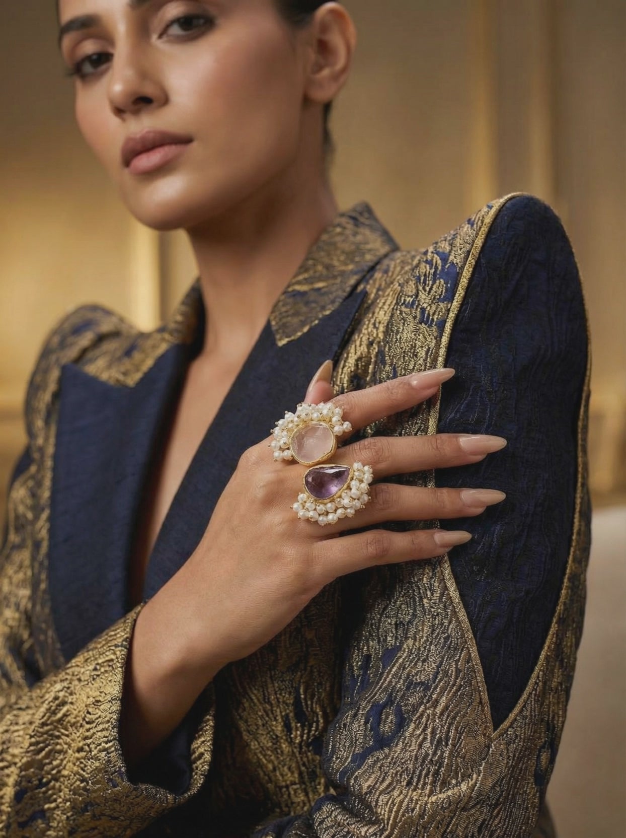 The Power Accessory: Wear the bold Sunburst or Amethyst Halo on your index finger to command attention. Pair them with a structured black blazer for a high-contrast, professional look.